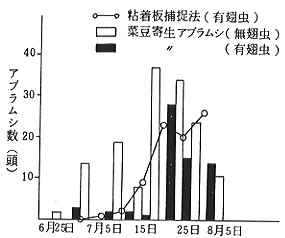②種類は不明であるが、粘着板捕捉による有翅虫のピークと菜豆寄生有翅虫のピークが、ともに7月下旬であった。このことからアブラムシ有翅虫の飛来数が多い7月下旬頃は菜豆への寄生数も多いと考える。(図3)