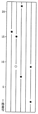 ③農試ほ場内において、ウイルス病の発生分布を調べた結果、連続的でなく散発傾向であった。(図2)