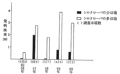 ⑤胆振管内(大福ほ場)におけるほ場周辺のシロクローバ量とウイルス病発生の関係を調べた結果、明らかにシロクローバの多いほ場でウイルス病が多く、その差は発病株率で1.5〜45倍であった。(図4)