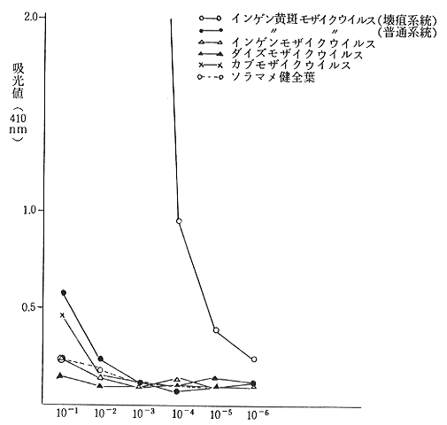③壊疽系統の抗体を用いたエライザ法では、他種ウイルス(普通系統、インゲンモザイクウイルス・ダイズモザイクウイルス・カブモザイクウイルス)との判別が可能であり、簡易検定法として実用性がある。(図5)