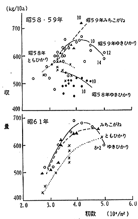 (1)「ゆきひかり」の最適籾数・総籾容積は「みちこがね」、「ともひかり」に比べて少なく、籾数過剰による稔実籾登熟歩合の低下と減収が著しかった。「ゆきひかり」の安定多収の目標籾数は3.5万粒/㎡程度と判断された(図1)。
