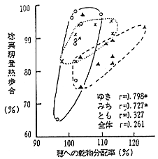 図2 穂への乾物分布率と稔実籾登熟歩合の関係(昭61年)