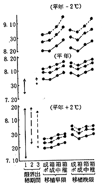 4)これら各地の限界出穂期間内に出穂し得る品種(キタアケ,キタヒカリ,マツマエ),苗の種類(成苗ポット苗,箱マット成苗,箱マット中苗,稚苗),移植期(移植早限,移植晩限)の組合わせを簡易有効積算気温を用い,平年気象値からの気温変化別に明らかにした。