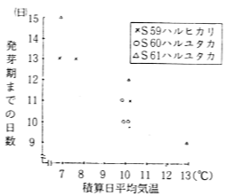 (1)発芽期まで日数に要する積算平均気温は100℃±10℃前後で,積算日平均気温が7℃で13日〜15日,10℃で10日〜12日,13℃で9日要した。(図1)