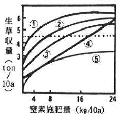 3.このため、目標収量を生草で4.5t/10aとした場合、年間のN施肥適量は草地の植生タイプによって異なり、タイプ①(RC,WC30%以上)=4〜6kg/10a、タイプ②(WC20〜30%)=6〜8kg/10a、タイプ③(WC10%程度)=10〜14kg/10a、タイプ④(TY単−草地)=14〜16㎏/10aであった。タイプ⑤(荒廃草地)は、20kg/10aまで増肥しても目標収量に達しなかった(図1)。