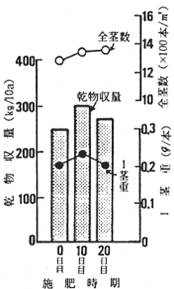 6.チモシー草地の2番草収量は、1番草刈取り後10日間程度経過し、チモシーの養分吸収が旺盛となる独立再生長期のN施肥によって、最も高まった(図4)。
