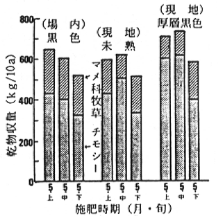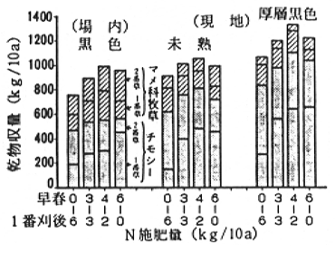 9.また、未熟火山性土および厚層黒色火山性土の混播草地で実施した現地試験においても、効率的なN施肥時期および施肥配分は、上述した場内(黒色火山性土)試験で得られた結果と同様であった(図6,8)。