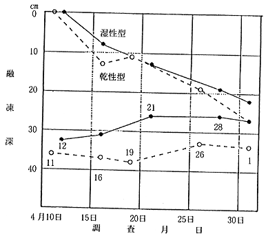 | 1試験 | 乾土100g/㎡の散土処理で7日前後融雪が促進された。土壌凍結深35〜44㎝の時融 雪,穿孔処理(直径14㎝,深さ60〜70㎝,穴間隔2㎝)によって融凍は乾性型火山性土 で5〜11日,湿性型では3〜8日促進された。 融凍後の土壌含水比は,乾性型の低下が早く,初期水分が高い湿性型は減少が緩慢で あった。散土作業能率は0.67ha/h,穿孔作業能率は0.29ha/hである。 |