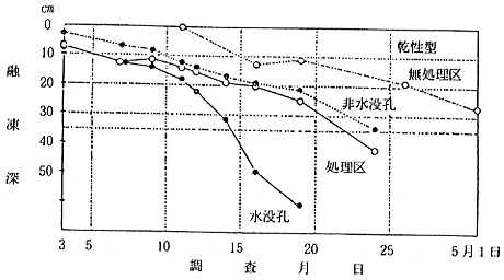 1.融凍の促進を図るには,融雪促進をかねた散土処理が効果的である。なお,融雪後の穿孔処理との組合せにより,融凍は進むが,この場合には土壌凍結深を考慮して,実施の判断をする必要がある。