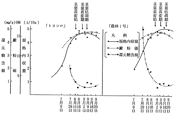図3 澱粉価と還元糖分含量および塊茎肥大の推移