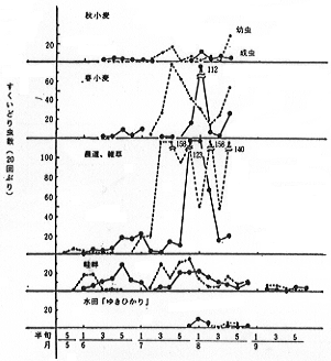 (1)調査方法についてみると、補虫網によるすくい取りは各世代とも把握できて安定した方法である。これに比し、誘蛾灯は第1回成虫は誘殺されないが2・3回目は消長が明らかになり、黄色水盤は全般的に少ない捕獲数であるが第1回成虫も把握できること、吹流しは第2回成虫しか捕獲できないが移動の状態が推定できるなど、それぞれ特徴があった。