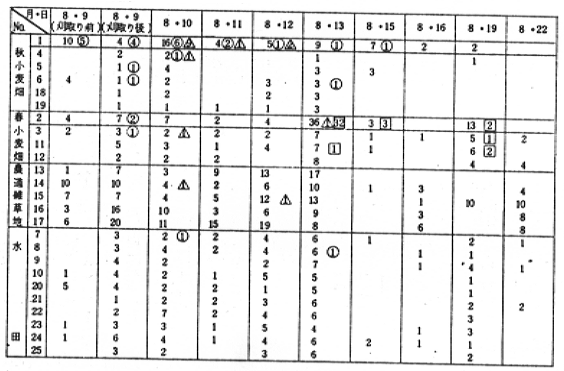(1)発生消長、水田周辺の畦畔・農道・小麦畑などにおける消長調査