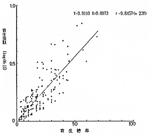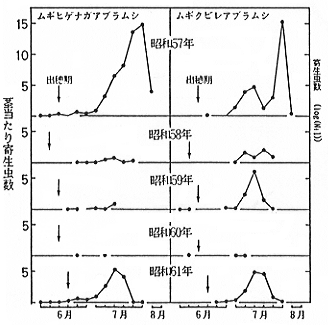 (4)寄生密度は出穂前には低く、出穂期以降増加し始めるが、本格的に高まるのは出出穂10〜20日後からである。従って、多発するかどうかはこの時期の環境条件に左右され、降水量の多い年ほど発生の少ない傾向がある。