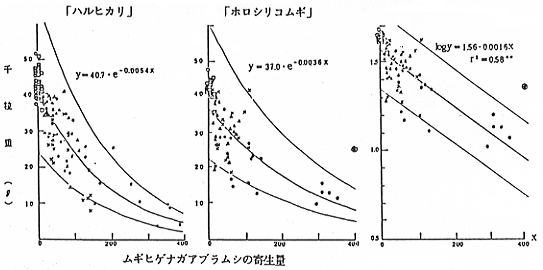 (2)アブラムシの吸汁によって千粒重が低下し、屑粒歩合が高まるが、被害許容密度は穂当たり7〜11頭くらいである。