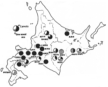 (2)加害の主要種はTyrophagus similisであった。他にTyrophagussp.No3(未同定)、Mycetoglyphus funginorusがTyrophagus simillis同様にホウレンソウに被害を与えていた。しかし、これら2種の分布は限られている(図1)。