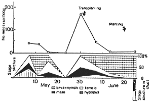 ア.ケナガコナダニは育苗時の高温多湿条件下で急激に増加した(図5)。