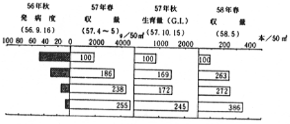 ⑤茎枯病の発生は収穫終了時期を遅くすると少なくなる。また,地表被覆あるいは覆土,薬剤の灌注,さらに茎葉散布を組合せることが有効であると結論した(表−10,表−11)。