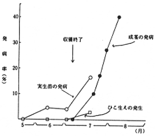 ②本病は若茎には発病せず,成茎になって発病し,7月から9月にかけ次々と新しい病斑を形成し,まん延する。