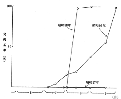 ②成茎の発病は,7月初旬から中旬にかけ見られ,その後急激に増加する。多発年と少発年の6月下旬から7月初旬の総降水量はそれぞれ,54〜100㎜,4〜7㎜であり,これが成茎の発病に影響すると推定した(図−3,表−6)。