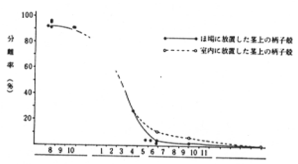 ①越冬後の枯死茎上の柄子殼は,4月中旬で30%,5月中旬〜6月下旬にかけ2〜4%の生存率であったが,第一次伝染源としては充分だと推定した。また,種子からも本菌が分離され,種子伝染の可能性が示唆された(図−2)。