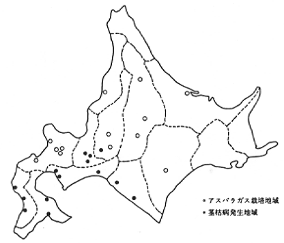 茎枯病の発生は,渡島,桧山の道南沿岸地帯だけでなく,昭和55年から56年にかけて西胆振地方で大発生した。昭和57年には空知南部,石狩南部の内陸にも発生が確認された。また,昭和59年から60年にかけて,日高沿岸地域でも発生を確認した(図−1)。