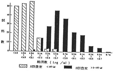 1)農家バルク乳の細菌学的乳質には季節的傾向はみられなかった、しかし、良質乳出荷農家(A群)がある一方、常に不良乳を出荷する農家(B群)があることが明らかとなった。 農家バルク乳の総菌数、生菌数および低温細菌数の幾何平均は1.3×105、7.6×104および1.1×104であった。生菌数と低温細菌数の間に正の相関がみられたが、低温細菌数における農家間のバラツキは大きく著しい汚染の例もみられた。