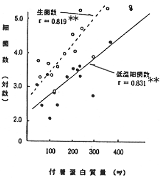 4)低温細菌は搾乳過程で生乳に混入していた。生乳がティートカップユニット及びパイプラインを通過することにより生菌数及ぴ低温細菌数は段階的に増加した。 また、搾乳器具表面の蛋白質の量と付着細菌数の間には高い正の相関が認められた。