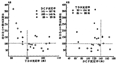(3)上記(1)、(2)で受胎した24頭について検討した結果、分娩後100日以内に受胎させるためには分娩後2〜14週のTDN充足率が90%以下にならないようにし、なおかつ、DCPの充足率が140%を超えないように飼料を給与する必要のあることが認められた。