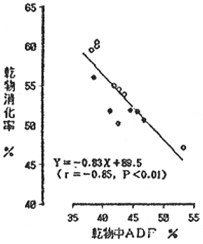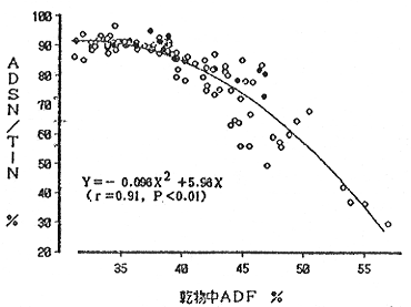 4)くん炭化に伴い,ADFは増加,ADSNは減少の傾向を示し、ADFは乾物消化率,ADSNはCP消化率との間に,それぞれ高い1次の相関関係が認められた(図1,2)。また,2番乾草のADFとADSNとの間には2次の相関関係が認められ`(図3),原料草を含む良質乾草の判定にはADFを,くん炭化傾向が認められる乾草の場合にはADSNを指標とするのが適当と判断された。