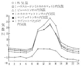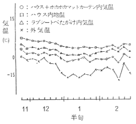 5.保温方法については、被覆資材の保温性、ラプシートベたがけの効果について検討を行った。夜間の保温性はホカホカマットが最も良く、日較差も小さく、冬期間のカーテソ資材として適当と考えられた。ラブシートのべたがけについては、作物の生育に対する効果は判然としなかったが、夜間の保温性が高く、日較差も少なく、厳冬期の保温に効果があると考えられた。