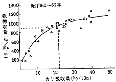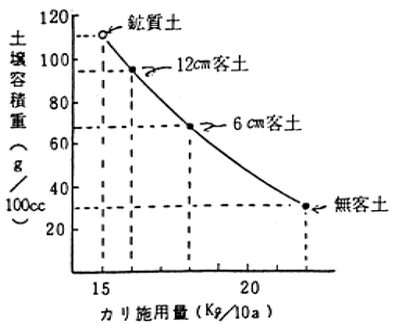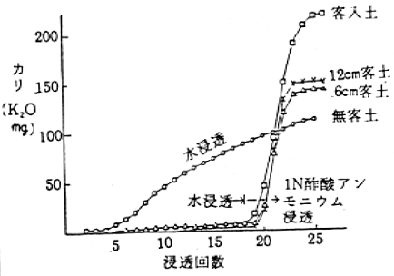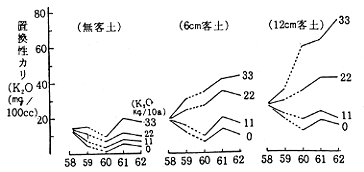 (2)泥炭土はカリの保持力は劣るが、客土によって著しく向上した(図-1)。また、そのカリ供給量は土層0〜10cmの置換性カリに利用率80%を乗ずることにより査定できた(表-1)。