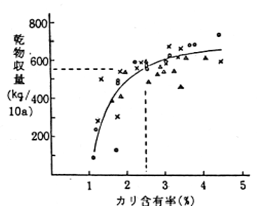 図2 牧草のカリ含有量と収量の関係(1番草)