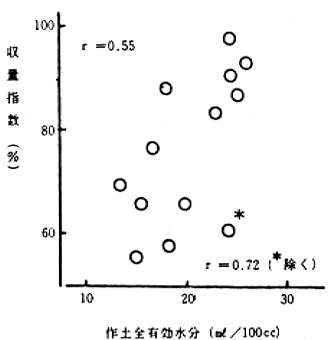 ②天北地方に分布する主要土壌の固相率は疑似グライ上>褐色低地土>褐色森林土>褐色火山性土の順で大きく、0〜50cm土層当りの有効水容量は疑似グライ土が著しく少なかった。また、降水不足時の収量低下程度は作土層の全有効水分の少ない草地が大きかった(図2)。