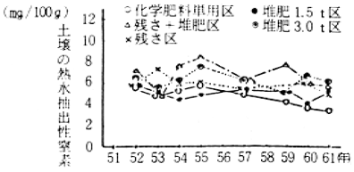 ①熱水抽出性窒素でみる土壌窒素は化学肥料単用・残さ持ち出し区では減耗傾向であり,化学肥料単用・残さ還元区では維持傾向であった。