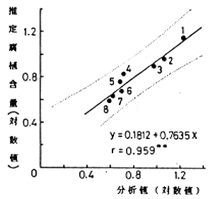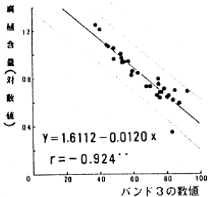 3) 出力には両年とも相関係数が高く、かつ回帰係数が有意となったバンド3を用いて、Y(腐植含量の対数値)=1.611-0.012X3(バンド3の数値データ)、r=-0.924**の推定式を得た(図1)。