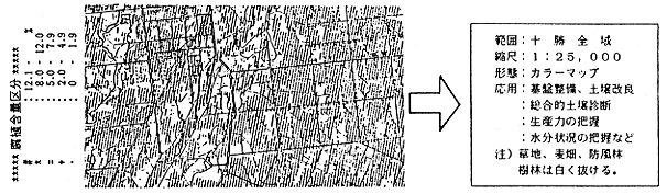 ①出力する属植含量の区分値として地力保全基本調査の基準値をあてはめると5〜10%(富む)の区分域に偏った。そこで土壌調査ハンドブック(ベドロジスト懇談会編)を参照して、区分値を0〜1.9%、2.0〜4.9%、5.0〜7.9%、8.0〜12.0%、12.1%以上の5段階とした、カラー出力が可能な解析手法(ソフトを含めて)を開発した。