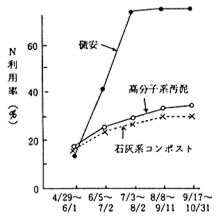 ①Nの利用率は25〜30%であった。枠,圃場試験の結果から,化学肥料Nの代替率は30%程度と評価され,石灰系汚泥コンポストよりやや高い。またN肥効の持続性,残効性でも同様にやや高い。