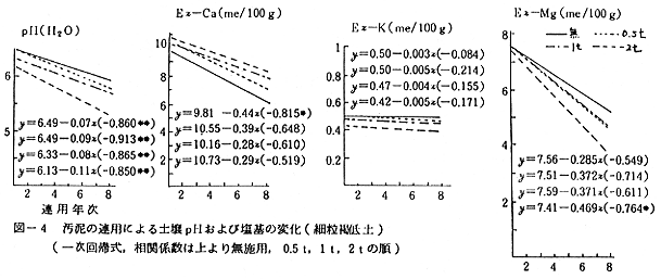 ②汚泥の連用によって置換性石灰は高まったが,同苦土,同カリでは減少して土壌の塩基バランスが乱れた。とくに1,2t/10a連用で顕著であった。