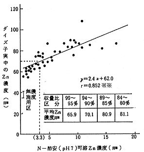 ③ダイズの収量に及ぼす許容限界濃度を硫酸亜鉛施用条件下で検討すると、子実中亜鉛濃度が70ppmであることがみられ,その時の土壌中のN−酢安(pH7)可溶亜鉛は3.3ppmであった。