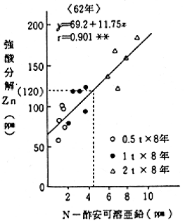 ④高分子系汚泥亜鉛を8年間連用した土壌では,この3.3ppmを超える土壌も多いが,ダイス収量は減収せず,硫酸亜鉛と汚泥施用土壌のN−酢安可溶亜鉛の質的差がみられた。