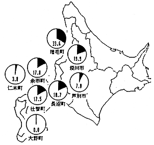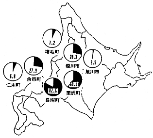 図1 昭和60年の市町村別オウトウ被害果率(品種は「北光」)