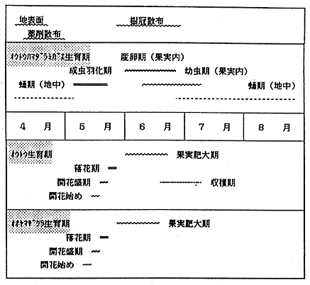 (2)防除の重点を果実への産卵防止に置き、産卵初期またはその直前から樹冠散布を始め、その後産卵終息期までほぼ1週間おきに3〜4回実施するのが効率的である。