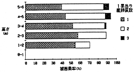 2)被害量の有意な品種間差は認められなかった。園内の被害分布は周辺部で多く、高さ別分布では地上4〜6mでの産卵量が多かった(図3)。