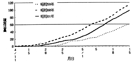 (1)発生期の予測に際して、根雪終日から約1ヶ月後を、または地温を用いた有効積算温量(発育零点を6℃として)が63日度に達する日を羽化開始時期の指標として用い、それから約25〜30日後を産卵開始時期の目安とすることが出来る。