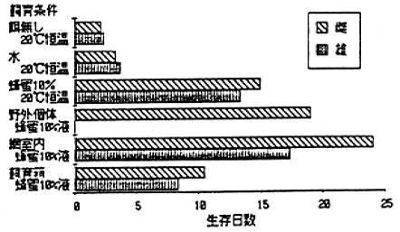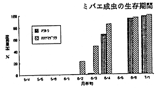 2)蜂蜜を餌として与えた成虫の生存期間は2〜3週間以上に及んだ。自然条件下では更に長引くと思われ、羽化開始時期から産卵開始時期までの期間にほぼ相応する。雌雄の性比は等しく、羽化消長や生存期間にも雌雄差は認められなかった(図3)。