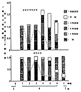 3)産卵初発は5月下旬〜6月上旬に見られ、羽化時期の25〜30日後に当たり、オオヤマザクラでの産卵がオウトウに先行し、両者の生育期の差によるものと考えられた.幼虫の艀化は6月2半旬、果実からの脱出と蛹化は6月6半旬から見られた(表2、図8)。