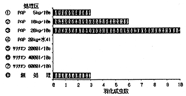 1)羽化前の蛹を対照とした地表面薬剤散布試験の結果、PAP粉粒剤の場合予期した効果を得るには散布後の十分な降水もしくは散水が必要と考えられた。サリチオン水和剤の1000倍液を地表面散布した場合の防除効果は認められたが、大面積を用いた試験例を重