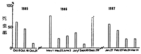 ア.抵抗性チリカブリダニのMEPによる死虫率は、散布を繰り返すことにより低くなった。しかし、4〜6ヶ月の散布停止によって感受性の復元が認められた。