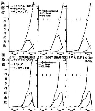 オ.キュウリで使用される殺菌剤では、TPN,ポリカーパメート,トリアジメホン,マンゼプ・メタラキシル,トリフミゾールは死虫率が低く、ほとんど悪影響は認められなかった。マンゼブ,ホセチル・マンゼブではやや死虫率が高かったが、産卵・増殖等に対する悪影響は認められなかった。