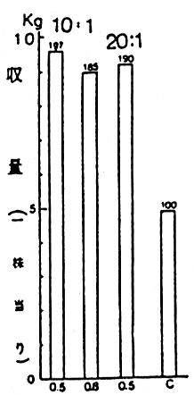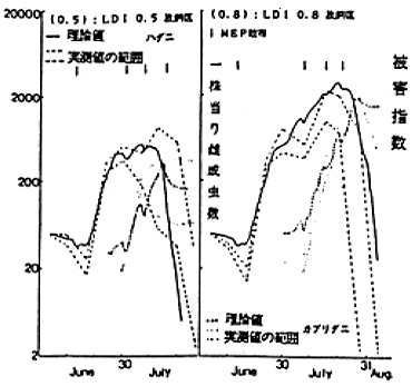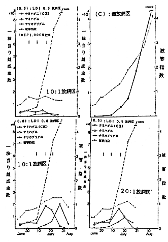 オ.同上条件下での20:1の比率の放飼では、LDI(0.5)でのみ充分な防除効果と収量が期待されると考えられた。